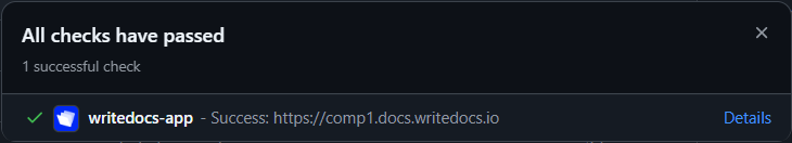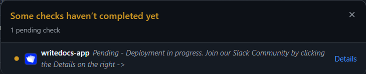 Whenever a new push is commited to your main branch, WriteDocs will keep you informed of the deployment status of your updates. You can keep track of this in your repository's main page.